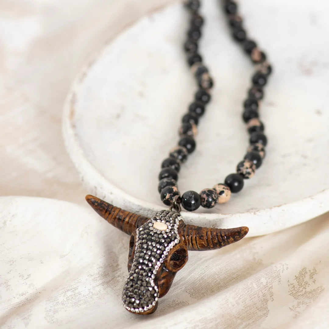 This long beaded chain necklace is made from black jasper stones. A beautiful crystal buffalo head pendant with white third eye highlights the spiritual qualities of this animal.