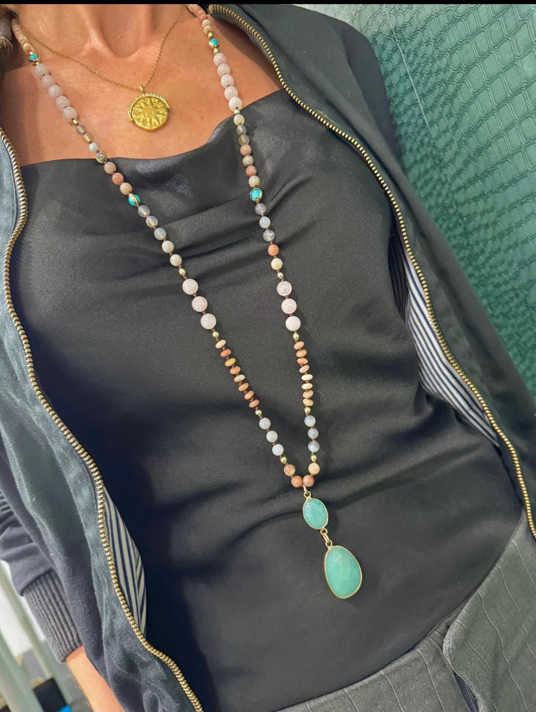 Finished with a bright amazonite double drop pendant, this piece adds a fresh pop of colour and a touch of boho glamour, making it perfect for layering or wearing as a standout piece on its own.